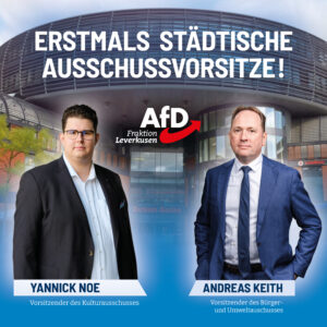 Am 3. November hat die AfD Leverkusen ihre Arbeit im neu gewählten Stadtrat sowie in den drei Bezirksvertretungen aufgenommen – und konnte dabei direkt mehrere politische Erfolge erzielen. Erstmals in der Geschichte der Partei stellt die AfD in Leverkusen Ausschussvorsitzende und ist in nahezu allen städtischen Gremien vertreten.